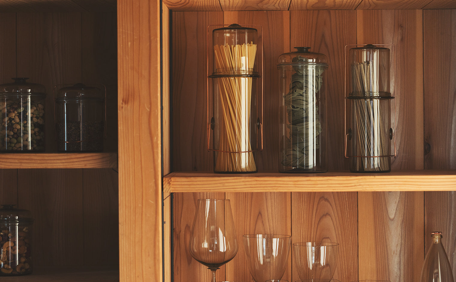 A tall storage container that stands there, flowing as though naturally in place. Occasionally, it could be interesting to pickle using a different vegetable cut to complement the container. You could even casually arrange plants and greenery. It enhances and draws out the inherent beauty of whatever it holds.